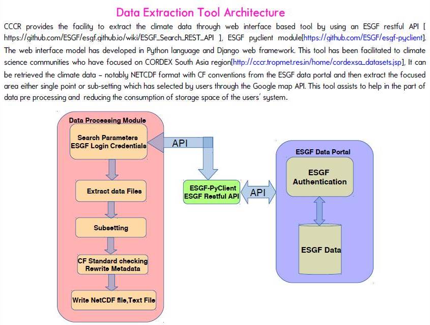 This is a trial version of a Web Interface based on python under development by CCCR-IITM for users to explore and remotely access subsets (some variables in a particular region for a particular time slice) of authorised datasets available on ESGF in the framework of CORDEX South Asia simulations, and download the selected subset in CSV, Text or NetCDF data formats.